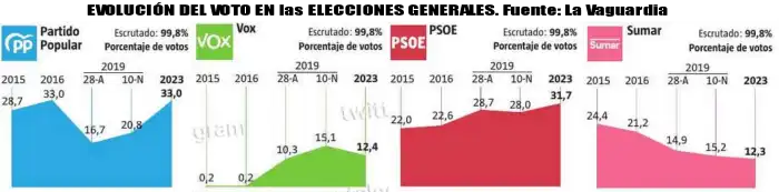 El periódico La Vanguardia del 24 de Julio ha publicado unos gráficos ilustrativos de la evolución seguida por el voto a estas 4 opciones electorales.