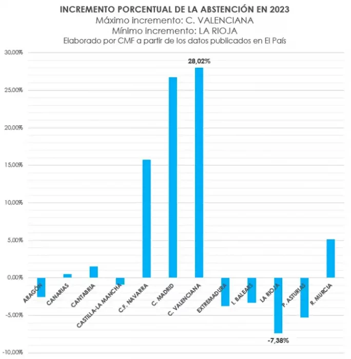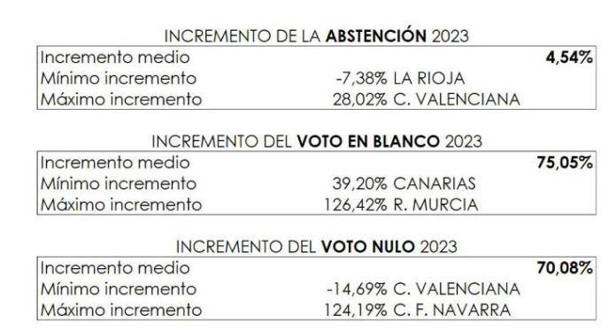 Aunque los valores absolutos de nulos y blancos son siempre muy inferiores a los de la abstención, sus incrementos porcentuales han sido notables en mayo de 2023.