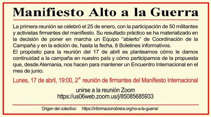 El propósito para la reunión del 17 de abril es plantearnos cómo le damos continuidad a la campaña en nuestro país y cómo participamos de la propuesta que, desde Alemania, nos hacen para mantener un Encuentro Internacional en el mes de junio.
