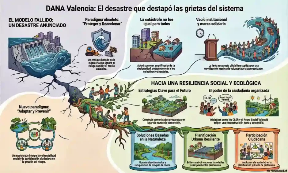 Construir comunidades resilientes supone fortalecer las capacidades sociales, mejorar la gobernanza democrática multinivel y diseñar un modelo territorial más seguro, sostenible e inclusivo, antes de que llegue la siguiente riada o el próximo desastre. Hay que transformar la tragedia sucedida en un catalizador para un cambio estructural dentro y fuera de las poblaciones afectadas por la DANA, asegurando que la próxima vez el barro y el agua no encuentren grietas sociales que convertir en abismos.