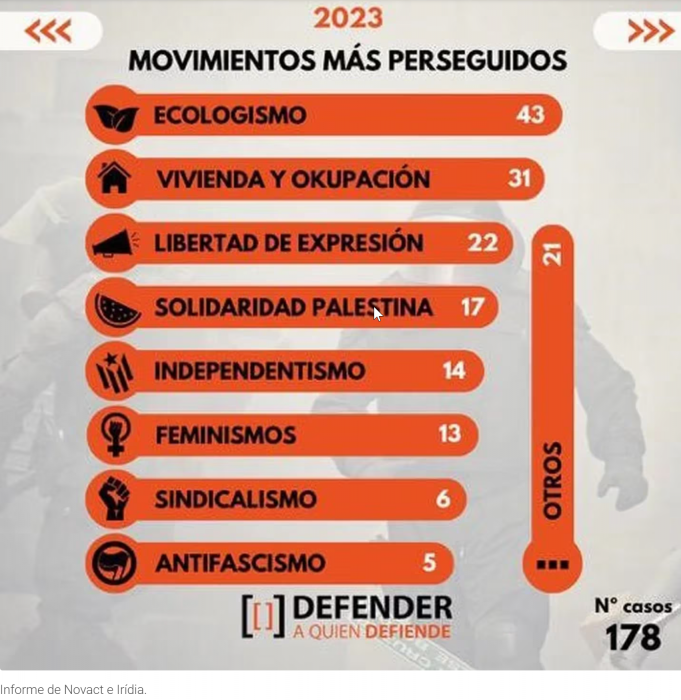 Buena parte de este incremento de la vulneración del derecho a la protesta se debe a cuatro fenómenos: la reciente ola represiva contra colectivos y organizaciones ecologistas, las movilizaciones en solidaridad con el pueblo palestino en medio de la guerra entre Israel y Hamás, el movimiento en favor de la vivienda y la okupación y las vulneraciones relacionadas con la libertad de expresión y de información.