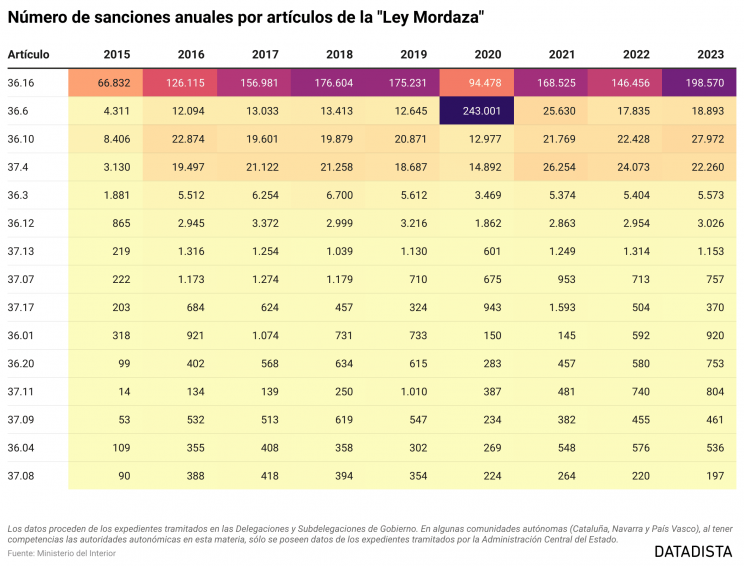 Hoy vamos a contarte una historia sobre la ley mordaza, la lucha durante años del Defensor del Pueblo pidiendo su modificación o derogación, la opinión de Europa, además de actualizar los datos del número de sanciones y la cuantía que ya te hemos contado desde hace años en informaciones como esta. Hasta finales de 2023, se han impuesto 2.155.990 sanciones al amparo de la ley mordaza que equivaldrían a 1.200 millones de euros. Las cifras, además, están infravaloradas porque en Cataluña, Navarra y País Vasco, con policías propias, sólo se poseen datos de los expedientes tramitados por la Administración Central del Estado.