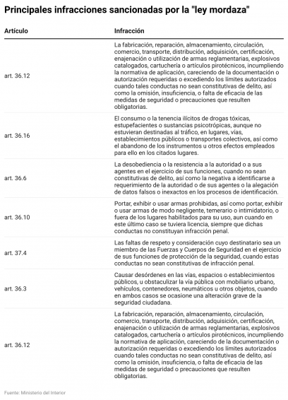 Desde los artículos 35, 36 y 37 de la ley mordaza, bajo el epígrafe de infracciones muy graves, graves y leves, se pasó a considerar sancionable con hasta 600.000 euros la celebración de espectáculos o actividades recreativas previamente prohibidas o suspendidas (artículo 35.3) o las reuniones o manifestaciones no comunicadas o prohibidas en instalaciones o infraestructuras básicas (art. 35.1). Con hasta 30.000 euros, las reuniones y manifestaciones frente al Congreso, Senado o asambleas autonómicas aunque no estuviesen reunidas (art. 36.2); los actos de obstrucción al cumplimiento de resoluciones judiciales por las autoridades (norma contra las protestas antidesahucios) (36.4), la “desobediencia o resistencia a la autoridad en el ejercicio de sus funciones” (36.6) y “el uso no autorizado de imágenes o datos personales o profesionales de autoridades o miembros de las Fuerzas y Cuerpos de Seguridad del Estado que pudieran poner en peligro la seguridad personal o familiar de los agentes” (36.23).