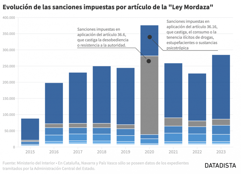 A pesar de que su uso había sido muy inferior respecto a las sanciones por consumo o tenencia ilícita de drogas, hasta entonces las que constituían la mayoría, el 11% de todas las sanciones desde que entró en vigor la norma en 2015 hasta finales de 2023, último dato disponible, se impuso entre marzo y abril de 2020, durante el primer Estado de Alarma, aplicando el artículo 36.6, que sanciona «la desobediencia o la resistencia a la autoridad, cuando no sean constitutivas de delito, así como la negativa a identificarse». La declaración de inconstitucionalidad, después revisada, de parte del artículado del Estado de Alarma abrió la puerta en 2021 a la devolución de estas sanciones, que llegaron a sumar en esos dos meses 161 millones de euros.