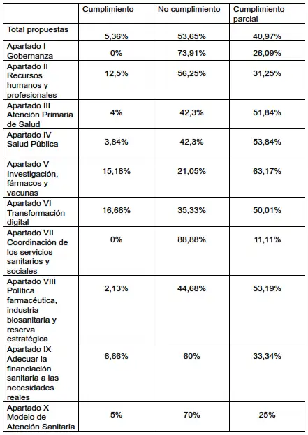 Esta evaluación, que se incluye al final pormenorizada en el Anexo ha tenido algunos problemas porque muchas de las propuestas son bastante genéricas en términos de “avanzar”, “fortalecer”, “trabajar”, etc., en estos casos hemos optado por incluirlas en el apartado de incumplimiento parcial salvo, obviamente, que se hubieran avances constatables significativos. Por otro lado, también hay algunas propuestas reiterativas (en todo o en parte), por ejemplo, el aumento de plazas MIR, que se han considerado como propuestas distintas.