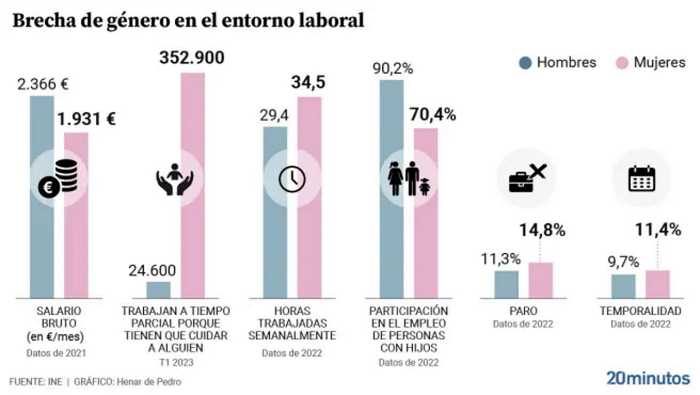 Todos estos factores acaban desembocando en una importante brecha de género en materia salarial y de pensiones. Así, mientras las mujeres perciben un sueldo medio de 23.176 euros brutos, los hombres se embolsan 28.389 euros. Una diferencia de 434 euros al mes (5.200 euros al año).