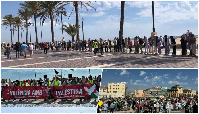 En la mañana del domingo 12 de mayo, en la playa de la Malvarrosa de València, se ha realizado una cadena humana exigiendo el cese inmediato de las agresiones sionistas y para reivindicar una «Palestina libre» y en paz.