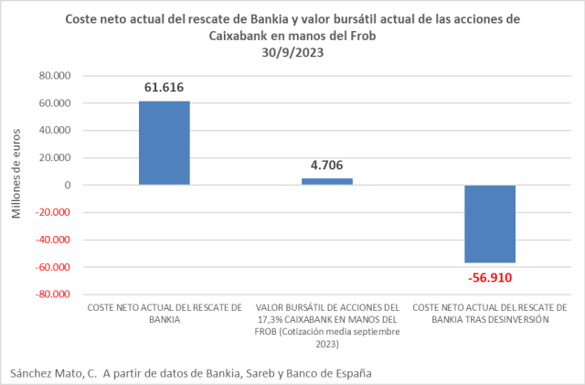Porque el rescate de Bankia no ha costado 22.000 millones como te cuenta la prensa. Asciende actualmente a 65.063 millones. A eso hay que descontar los 3.447 millones de ingresos por dividendos y venta de acciones. El coste neto asciende a 61.616 millones. Vender no arregla nada.