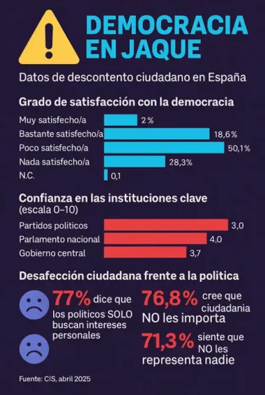 Aunque el 79,2% considera que la democracia es el mejor sistema de gobierno, solo un 20,6% se declara satisfecho con su funcionamiento actual. El dato no muestra un rechazo a la democracia, sino un miedo a su vaciamiento.