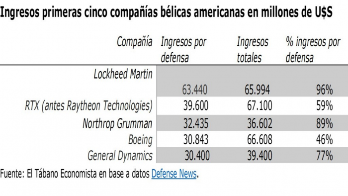Según el Instituto Internacional de Estudios para la Paz, las 100 principales empresas fabricantes de armamento generaron en 2021, en conjunto, 592.000 millones de dólares. Eso implica un incremento de casi el 2% con respecto al año anterior y en 2022 un 4% respecto al último aumento. Los fabricantes estadounidenses  siguen a la cabeza, con casi la mitad de las ventas mundiales, no es de extrañar, entonces, que las cinco primeras empresas productoras de armas del mundo por ventas sean todas estadounidenses: Lockheed Martin, Raytheon, Boeing, Northrop Grumman y General Dynamics. Tenga en cuenta que el gráfico muestra los ingresos de defensa de cada empresa y no los ingresos totales. Esto se debe a que muchas empresas, como Boeing, también generan ingresos de industrias y sectores no relacionados con la defensa.