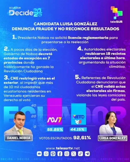 El joven empresario Daniel Noboa, heredero del imperio bananero más poderoso de Ecuador y rostro amable de la derecha neoliberal, ha sido reelegido presidente con el 56% de los votos, frente al 44% obtenido por Luisa González, candidata del correísmo. Con el 95% de las actas escrutadas, la diferencia ronda los 12 puntos. La victoria se presenta como arrolladora, pero lo que hay detrás es una maquinaria estatal desplegada para aplastar a la oposición, coartar derechos y blindar el continuismo de un proyecto político profundamente clasista, elitista y represivo.
