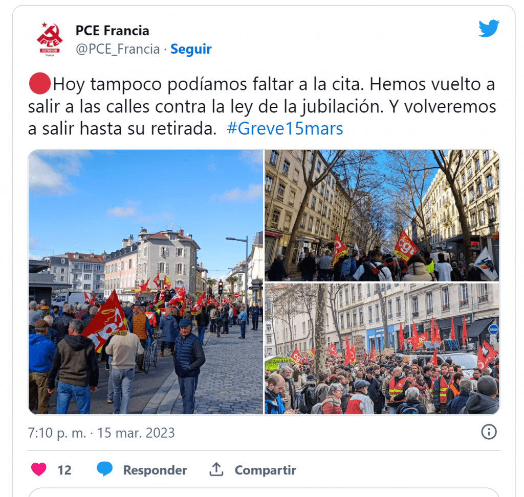 El PCE de exterior secunda las movilizaciones obreras contra la reforma francesa de las pensiones, al tiempo que en España aplaude la bastante más regresiva del gobierno de coalición PSOE-UP.