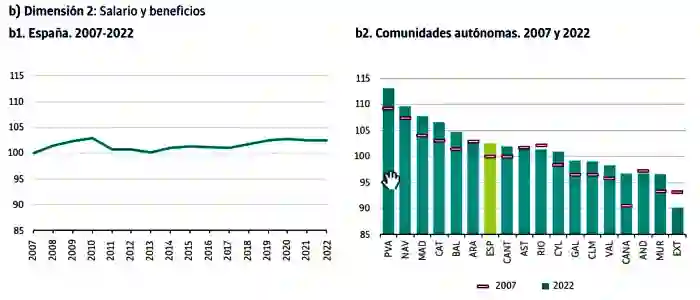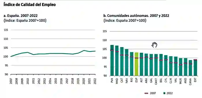 No obstante, la Comunitat Valenciana es la tercera autonomía en la que más ha mejorado la calidad de empleo tomando como referencia los datos de 2007, un año previo a las crisis económicas con niveles elevados. Está 3,4 puntos porcentuales por encima de la calificación de 2007, cuando en España se ha mejorado en 3,1 puntos. El índice ha aumentado en todas las regiones salvo en Extremadura.