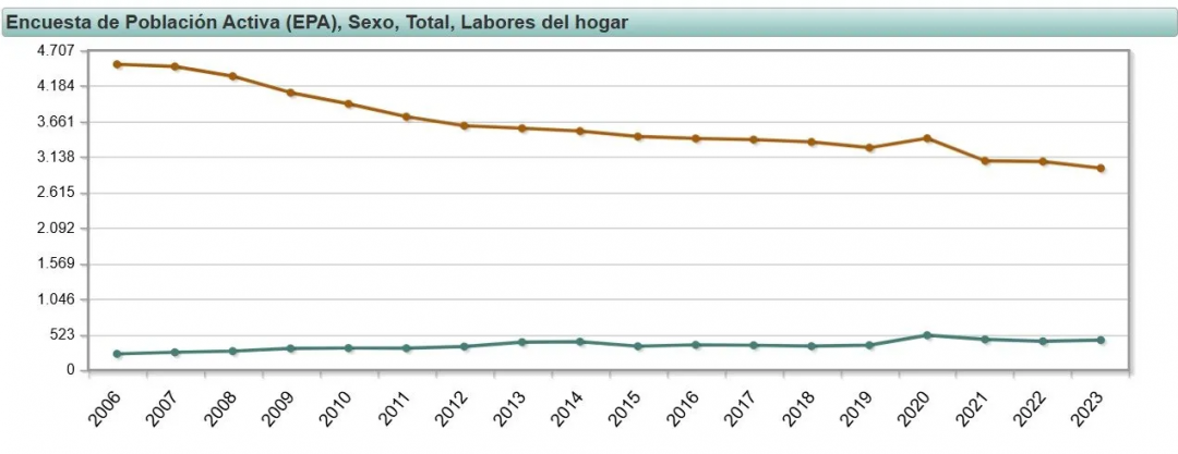 Como puede verse en la siguiente tabla, de 2006 a 2023 el número total de mujeres que en España figuran inactivas por dedicarse a las labores del hogar ha continuado disminuyendo. Ha pasado de casi 4,5 millones a 2,97 millones, cayendo hasta el 66%. En el mismo periodo, los hombres en esta situación han pasado de 240.000 a casi 448.000, aumentando hasta el 186%. Si estos representaban antes el 5% del total, ahora suponen el 13%; una minoría, pero en ascenso incluso dentro de un colectivo que va encogiéndose.