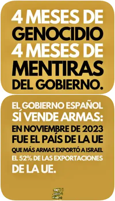 - El fin de la compraventa de armas a Israel para no ser cómplices del genocidio en la Franja de Gaza ni con la ocupación y el apartheid en Cisjordania, Jerusalén y la Palestina del 48.