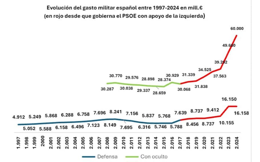 Desde hace años el investigador del gasto militar español, Juan Carlos Rois, viene denunciando el ocultamiento de más de dos terceras partes en distintos ministerios y organismos, y que en realidad los presupuestos de defensa que se publicitan no se comparecen con los reales. Así, en su trabajo «Balance de la política de defensa en 2024. Vuelta de tuerca militarista y construcción de un clima prebélico» publicado junto con el Grupo Antimilitarista Tortuga el 31.12. 2024, estima que en ese año 2024, año sin presupuestos del estado, el gasto militar estará por encima de los 60.000 millones de euros, lo que significa más del 5% del PIB. De este mismo trabajo, publicado en esta página el 8. 01. 2025, se saca el cuadro con la evolución del gasto militar oculto en 2024, 60.000 M, y el gasto reconocido, 16.158. y su conclusión.