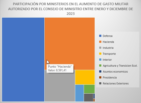 Llama la atención la contribución efusiva a la generación de este gasto militar por parte del Ministerio de Hacienda (que ha autorizado casi 8.600 millones del total) y del de Industria (casi 3.200 millones) en la generación de este enorme gasto.