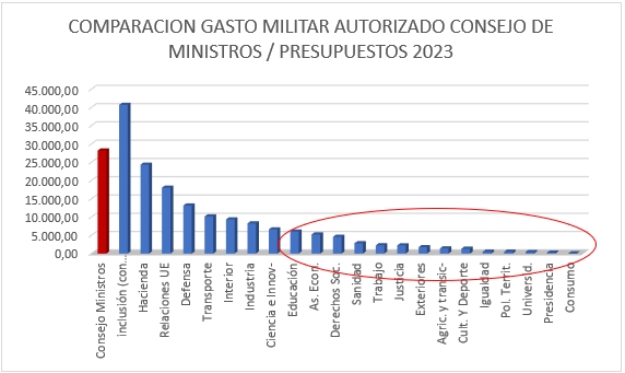 Si comparamos este espectacular aumento del gasto militar con las partidas con las que, en principio, contaron los distintos ministerios en los presupuestos de 2023, veremos el agravio comparativo que supone dedicar un esfuerzo económico tan espectacular a rearme y militarización en detrimento de las partidas sociales.