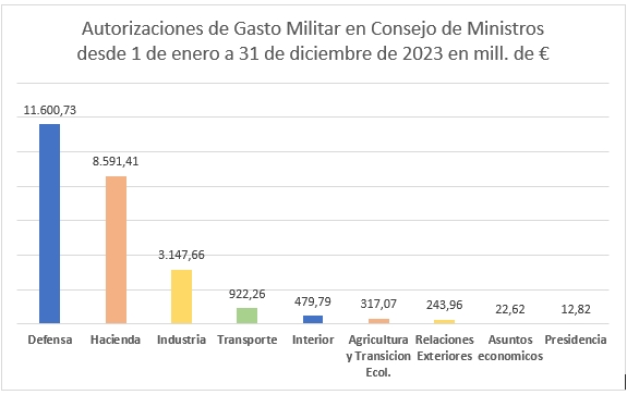 Durante 2023, los sucesivos Consejos de ministros han autorizado en 44 de sus sesiones y 166 de sus acuerdos la nada despreciable cifra de 28.232,23 millones de euros de aumento del gasto militar. Los acuerdos de autorización alcanzan, en algunos casos, varias anualidades futuras comprometidas y a todo tipo de conceptos imaginables, desde programas de armas a reparaciones y suministros, pasando por dotaciones de personal, intervenciones militares en el exterior, operaciones de especulación con propiedades de la defensa y un largo etcétera.