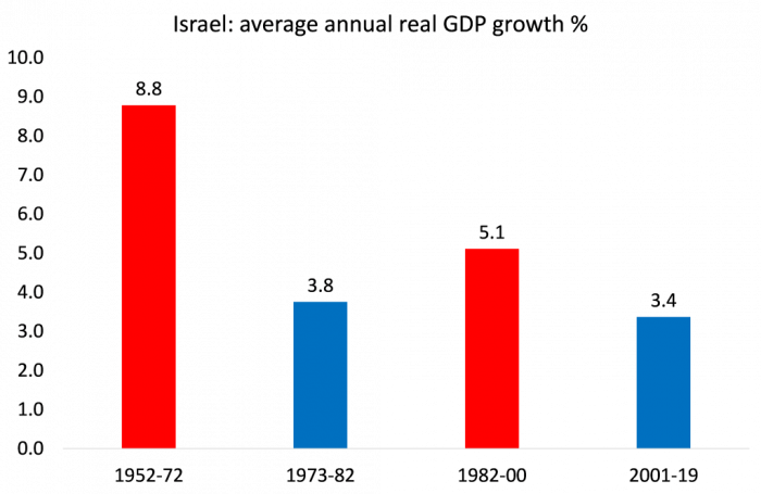 Las crisis económicas han continuado a intervalos regulares en los 21c siglo. En 2003, Netanyahu recortó las prestaciones sociales, privatizó más empresas estatales, redujo la tasa máxima del impuesto sobre la renta, recortó los servicios del sector público e impuso leyes antisindicales. Le siguió la Gran Recesión de 2008-9 y luego la caída pandémica de 2020, cuando el PIB cayó un 7%. El declive económico relativo de la economía israelí se revela en la tasa de crecimiento del PIB real en la Edad de Oro, la crisis de rentabilidad de la década de 1970, el período neoliberal y ahora en la Larga Depresión de la década de 2010 en adelante.