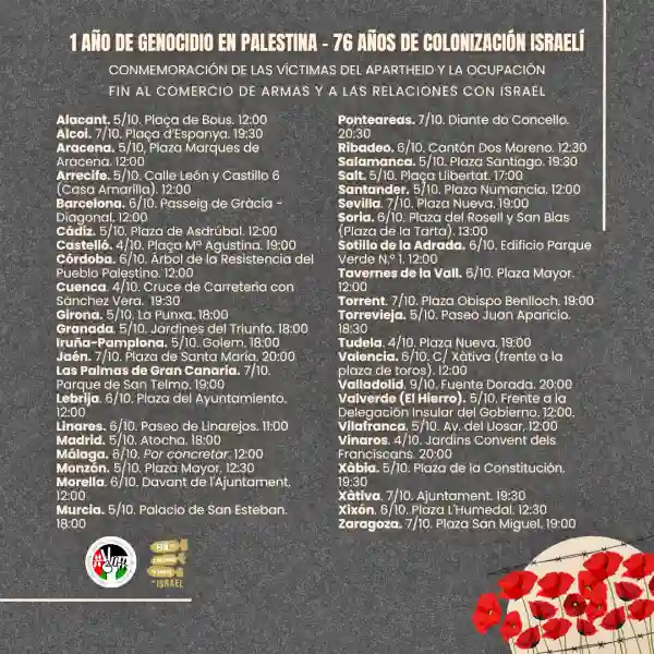 La Red Solidaria contra la Ocupación de Palestina (RESCOP) ha convocado protestas y una marcha en Madrid para el 5 y 6 de octubre. Convocatoria a la que han adherido decenas de organizaciones y colectivos, del mismo modo que ha ocurrido en las acciones convocadas también en más de 40 ciudades del estado durante esos mismos días.