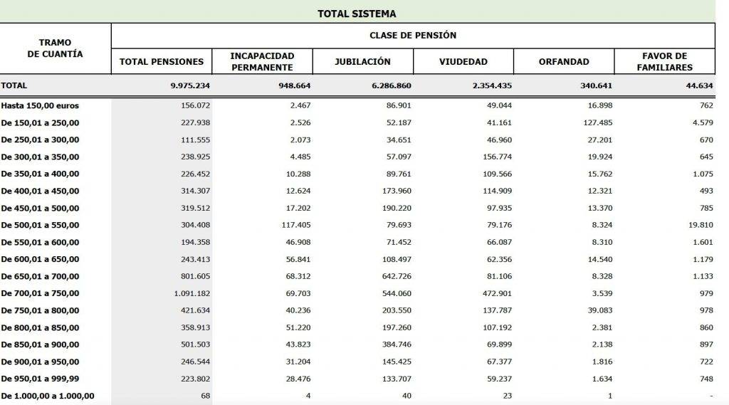 Actualmente en España hay casi 10 millones de pensionistas contributivos y más del 53% cobran menos de 1000 euros, especialmente las mujeres. Este el gráfico detallado de la distribución “mileurista” de cuantías y situaciones de noviembre del año pasado.