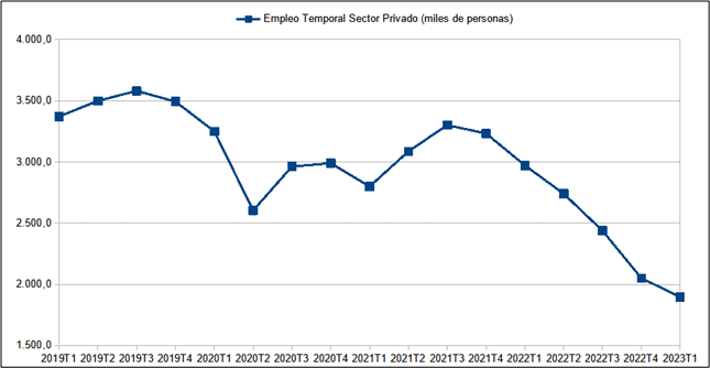 Cuando actualizamos dicho indicador para los datos del comienzo de este año 2023 la buena noticia es que se ha conseguido frenar dicha progresión en diez puntos porcentuales. Casi millón y medio de personas menos. No es poco tal como iban las cosas. Aunque solo en un vector el avance ha sido notable: la reducción de la contratación temporal en el sector privado. Algo sin duda imputable a la reforma laboral del año 2021.