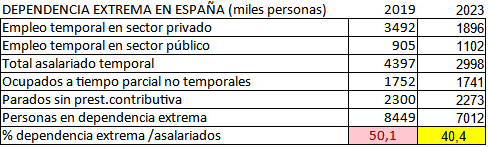 Con algunos de los mimbres que hemos revisado podemos tejer un indicador sintético sobre la evolución de la dependencia extrema de los trabajadores asalariados en España. En mi reciente ensayo “Trabajo y capital en el siglo XXI” (2022, página 31, ahora en acceso abierto aquí) concluía que en el año 2019 nos íbamos acercando al 50% del total de asalariados. Cerca de la mitad, una mala noticia.