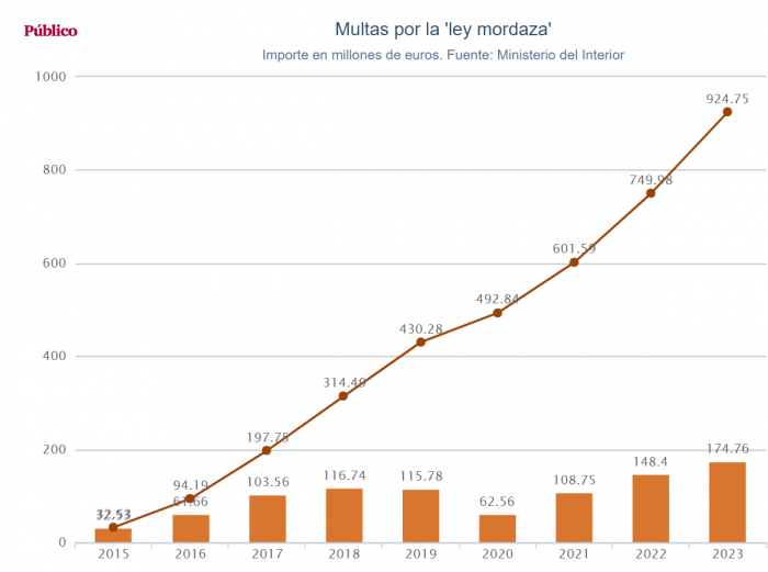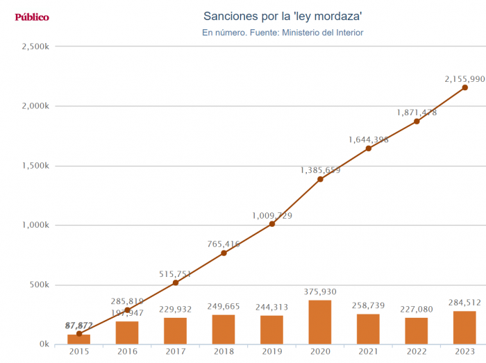 Las cuentas oficiales dicen que la aplicación de la ley mordaza no va en retroceso, al contrario, ha crecido. La última estadística anual del Ministerio de Interior refleja que en 2023 se impusieron 284.512 multas por la vulneración de su articulado, 57.432 más que el año anterior, lo que supone un incremento del 25% de la actividad sancionadora y una media de casi 780 multas diarias.