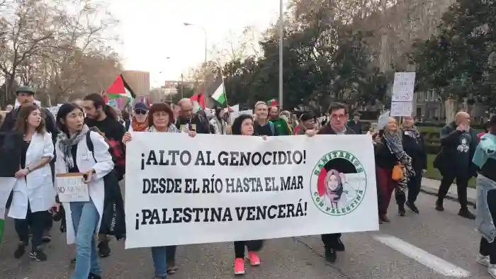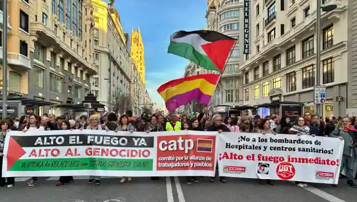 Apenas una semana después (convocatorias descentralizadas del 20 de enero en muchas ciudades) de que 50,000 personas abarrotaran las calles de la capital, la movilización ciudadana y de las organizaciones sociales y políticas de la izquierda ha vuelto a demostrar su fuerza, exigiendo un alto al fuego inmediato y permanente, el cese del genocidio del pueblo palestino, el fin del comercio de armas con Israel y la ruptura de relaciones del Estado español con Israel.