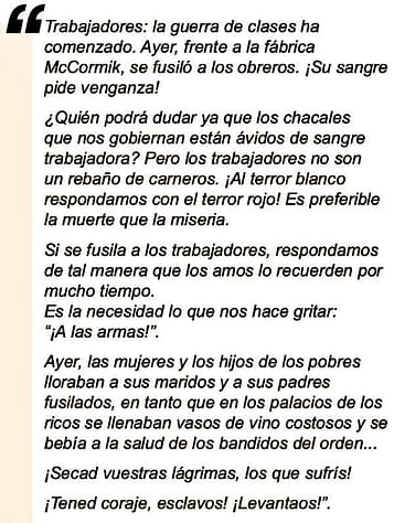 «Trabajadores: la guerra de clases ha comenzado. Ayer, frente a la fábrica McCormik, se fusiló a los obreros.
