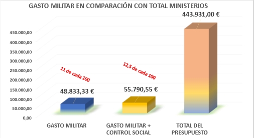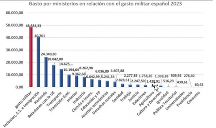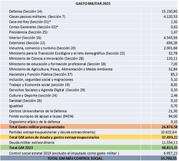 Dicho gasto, como hemos desvelado a lo largo del año, era mucho mayor, si sumamos a él el que se disfraza en diversos organismos y ministerios fuera del ministerio de Defensa y si sumábamos a ello tanto el sobre gasto en el que el gobierno suele incurrir año tras año (lo ciframos en su día en un 16%) y la repercusión de la deuda imputable a esto, y más aún si sumamos a todo ello la deuda militar extraordinaria. Y así llegábamos a la cifra brutal de 48.833,33 millones de euros, 3,7 veces lo presupuestado y más de 11 de cada 100 euros del presupuesto público, cantidad que aún podía incrementarse si sumáramos todo lo destinado en Interior para políticas securitizadoras y crecientemente militarizadas.