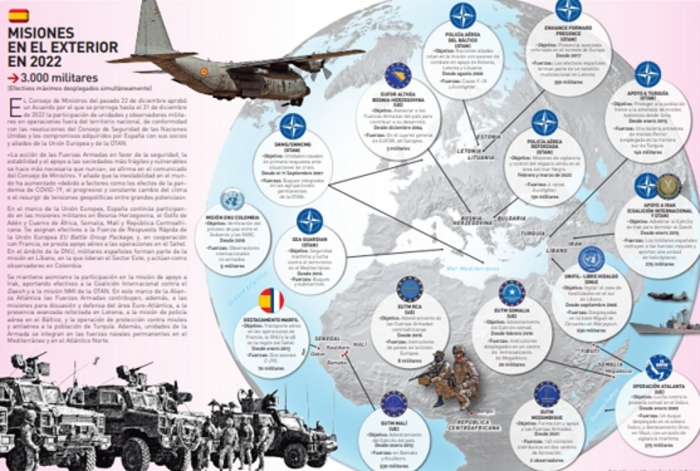 En la actualidad seguimos manteniendo 20 operaciones militares en el exterior, seis bajo la promoción de la UE, 2 de la ONU; 8 de la OTAN y 4 por propia iniciativa. Llama la atención el despliegue territorial de estas operaciones, prácticamente en nuestras« fronteras de seguridad avanzada», en el control migratorio del atlántico y el mediterráneo y en los puntos calientes del oriente medio y el este europeo donde la OTAN mantiene sus intereses geopolíticos.