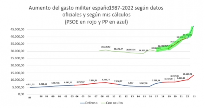 Prueba del descontrol indecente del gasto militar es que el propio gobierno ha reconocido hace unos días que el gato de defensa presupuestado ha crecido por encima del 25% en el año 2023, crecimiento que no ha merecido la crítica ni el control que los partidos políticos de la oposición suelen exigir en otros campos.