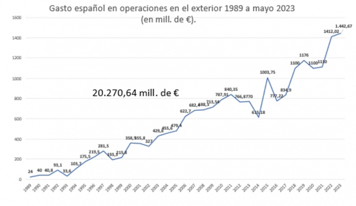 Para el mantenimiento de esta política de injerencia militar, además de lo presupuestado en los PGE en el ministerio de Defensa y en el de Asuntos Exteriores, España ha aprobado varios aumentos de los fondos de operaciones militares en el exterior en varios Consejos de Ministros, en concreto 581,25 millones el 11 de abril de 2023, 332,53 millones el 13 de junio y 471,85 millones el 25 de julio de 2023, un total de 1.385,63 millones de euros a los que podríamos sumar además los 339,71 abonados para la guerra de Ucrania, superando con creces los 1.400 millones que en su día presupuestamos para este tipo de operaciones en 2023.
