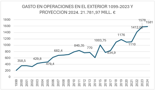 Vemos en el cuadro siguiente, de elaboración propia y basado en los datos oficiales más los que ocultan y se les escapan de vez en cuando que, desde 1999 a 2024 (este año con una proyección, pues solo cabe hacer una estimación) España ha gastado en participar en operaciones de injerencia militar nada menos que 20.781 millones de euros sin que pueda decirse que dicha cantidad ha propiciado ni un solo logro de paz en el mundo.