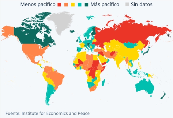 Pero ese campaneo le sale caro al planeta. Si comparamos el mapa elaborado por Defensa con otro relativo al índice de paz mundial, veremos la extraña casualidad de que gran parte de los peores escenarios para el índice mundial de paz coincide con el de nuestra presencia vigilando mares, asesorando países o posicionando tropas.