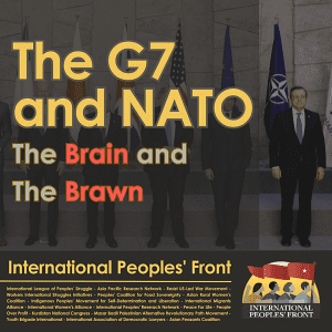 A esta campaña también se ha sumado el Frente Internacional de los Pueblos, que llama a movilizarse contra el G7 y la OTAN en este cartel con el lema: «El G7 y la OTAN: el cerebro y el músculo imperialistas«.