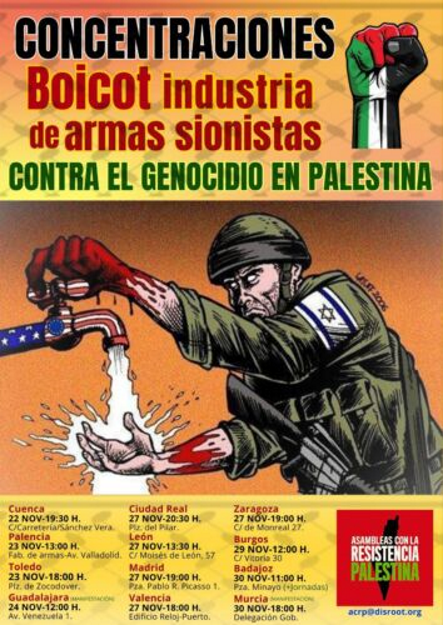 Por ello, desde Asambleas con la Resistencia Palestina, hacemos un llamamiento para sumaros a las convocatorias que han anunciado del 22 al 30 de noviembre en Toledo, Guadalajara, Burgos, Ciudad Real, Cuenca, Palencia, Madrid, Zaragoza, Badajoz, Valle del Tiétar y León, para denunciar la complicidad del estado español en el genocidio del pueblo palestino y del pueblo libanés, así como de todos los pueblos del Eje de la Resistencia, que finalizará con una manifestación unitaria estatal en Madrid el día 15 de diciembre de 2024 a las 12:00 hs, con el recorrido de la Embajada de Estados Unidos hasta el Ministerio de Defensa, entidad que autoriza el comercio exterior en materia de defensa».