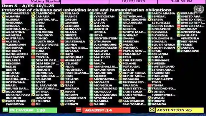 Esta propuesta de resolución, titulada (ver en el gráfico) por la «Protección de civiles y el cumplimiento de la legislación internacional de derechos humanos», obtuvo el respaldo de 120 votos a favor, 45 abstenciones y 14 votos contrarios. Es decir, no fue respaldada por 59 dignatarios de sus respectivos países.