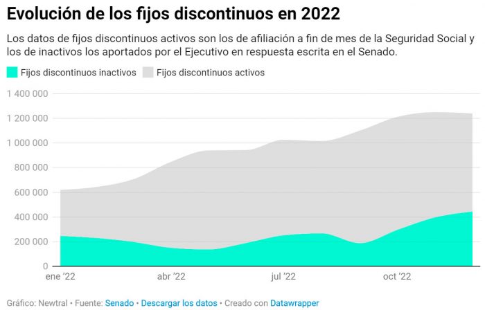 A pesar de que el Gobierno no contabilice como parados a los fijos discontinuos en inactividad y no dé los datos de la cantidad de contratos fijos discontinuos, es evidente que al tratarse de fijos discontinuos hay un periodo de inactividad cuando no se está trabajando y, por lo tanto, no se cobra un salario. Y el número de fijos discontinuos no para de crecer.