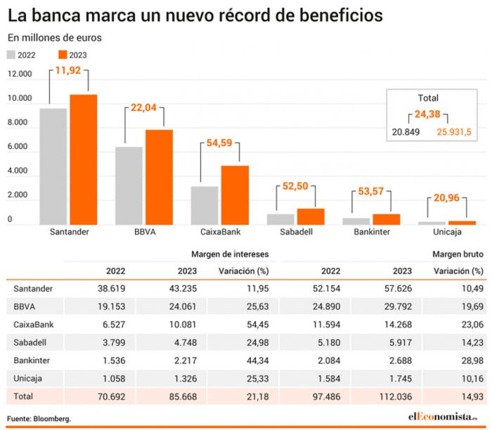 No sorprende la noticia de que la banca obtiene beneficios récord en 2023. Las seis grandes entidades del Ibex35 –Santander, BBVA, CaixaBank, Sabadell, Bankinter y Unicaja– ganaron casi 26.000 millones de euros, un 24,38% más que en 2022.
