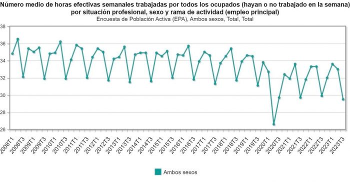 No hay más que observar que el número medio de horas por trabajador no ha dejado de disminuir desde 2008, según el Instituto Nacional de Estadística, pero sobre todo después de la pandemia: