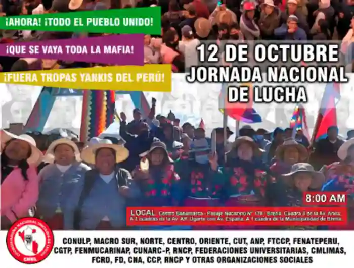 Convocamos a todas las fuerzas vivas, sociales, culturales, progresistas, nacionalistas, humanistas, gremialístas, económicas, trabajadores, estudiantes, colegios profesionales, iglesia católica y evangélica progresista, organismos de derechos humanos, periodistas que defiende la libertad de prensa y expresión, transportistas, pequeños y medianos empresarios, emprendedores, organización de mujeres, a la clase media, artistas e Intelectuales, pueblos Quechuas, Aymaras, Chankas, de la Amazonia, a todas Nacionalidades y Sectores Sociales ¡Sin exclusiones! a luchar todos unidos contra la mafia y la tiranía criminal.