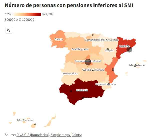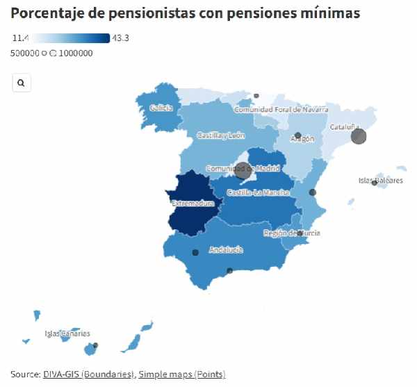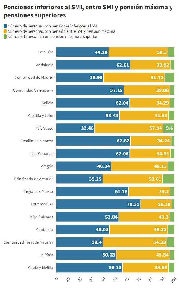 Por territorios, Andalucía es donde más pensionistas hay (1,5 millones), Castilla La Mancha es el que tiene la pensión media más baja (1.066 euros) y el País Vasco, la más alta (1.631 euros). Casi la mitad de los pensionistas de Extremadura cobran una pensión mínima (el 43%), porcentaje diez puntos menor en Andalucía (32,5%), del 31% en Galicia y del 30% en Murcia. En el País Vasco, donde nació el Movimiento de Pensionistas de Euskal Herria que lucha desde 2018 para que las pensiones mínimas partan de los 1.080 euros, solo el 11% cobra una pensión mínima.