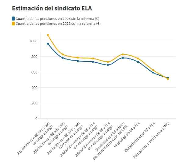 Según lo que se expone en el articulado de la reforma publicado en el BOE, el sindicato ELA ha calculado los aumentos y alerta, sin embargo, de que algunas pensiones mínimas solo subirán diez euros mensuales cada año. Advierte incluso de que, según los parámetros de umbrales de la pobreza y revisiones del IPC expuestos en la reforma, las pensiones mínimas no contributivas incluso podrían bajar de 525 a 510 euros. “Para las pensiones mínimas de jubilación para una persona de 65 años o más sin cónyuge a cargo y la pensión mínima de viudedad de las personas con más de 65 años, la cuantía pasaría en ambos casos de 783 a 828, lo que implica una subida de 45 euros al mes, que mantiene a esas personas en situación de pobreza”, señala el responsable del Gabinete de Estudios del sindicato, Mikel Noval.