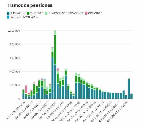 Una pensión mínima significa cobrar menors de 966 en 14 pagas si el pensionista tiene cónyuge a cargo y la jubilación ha tenido lugar con más de 65 años. Con cónyuge no a cargo, desciende a 743 y para una unidad económica unipersonal, se sitúa en los 783 euros. Con mucha diferencia, la pensión más habitual es la de 743 y le sigue la de 783.