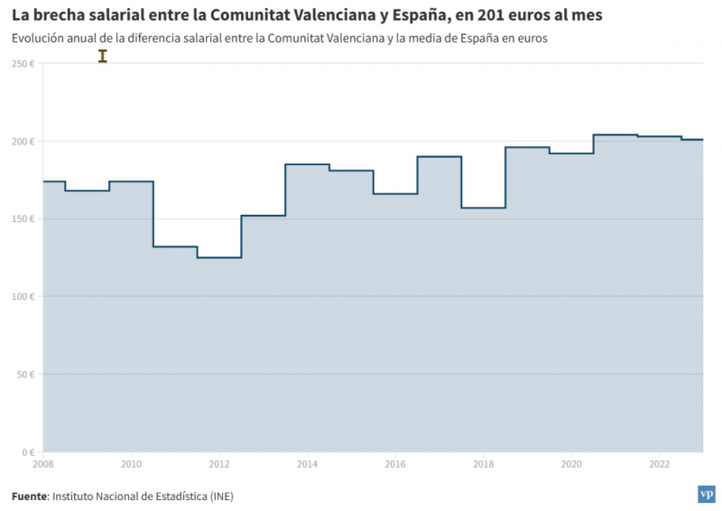 Aun así, la situación salarial de la autonomía valenciana ha mejorado levemente en los últimos años, ya que en 2014 solo cuatro regiones, Castilla y León, Galicia, Canarias y Extremadura, estaban por detrás de la Comunitat Valenciana en cuanto a retribuciones a trabajadores. Además, y después de que las diferencias retributivas respecto al conjunto del país se acentuaran en 2021 hasta alcanzar un máximo histórico de 204 euros brutos mensuales de media, la cifra se ha reducido ahora a 201 euros.