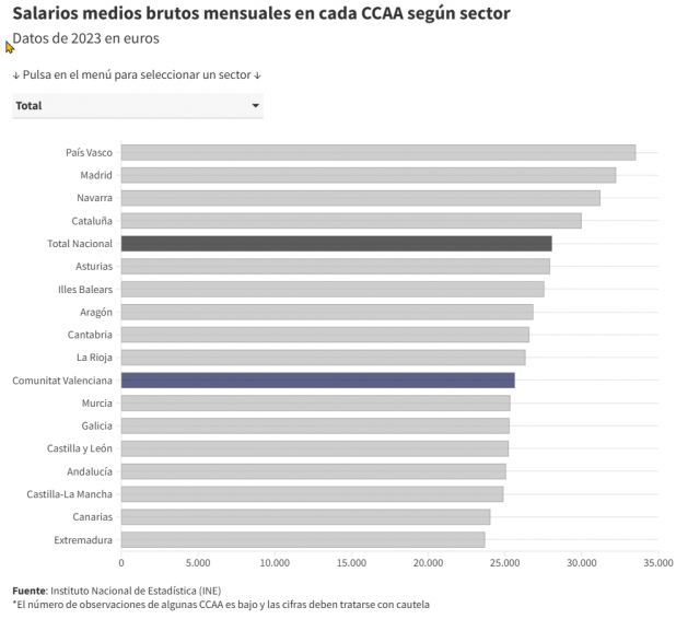 Los salarios, que por supuesto fluctúan en función de factores como el sector de actividad, la edad o el tipo de ocupación, estarían, en el caso de la Comunitat Valenciana, en torno a doscientos euros mensuales por debajo del promedio de España, y en términos generales dependen también de factores como los ámbitos productivos con mayor peso en cada región o su nivel de riqueza. Así pues, regiones como Aragón, Cantabria y La Rioja, y por supuesto País Vasco o Cataluña, mejorarían los niveles retributivos de la autonomía valenciana.