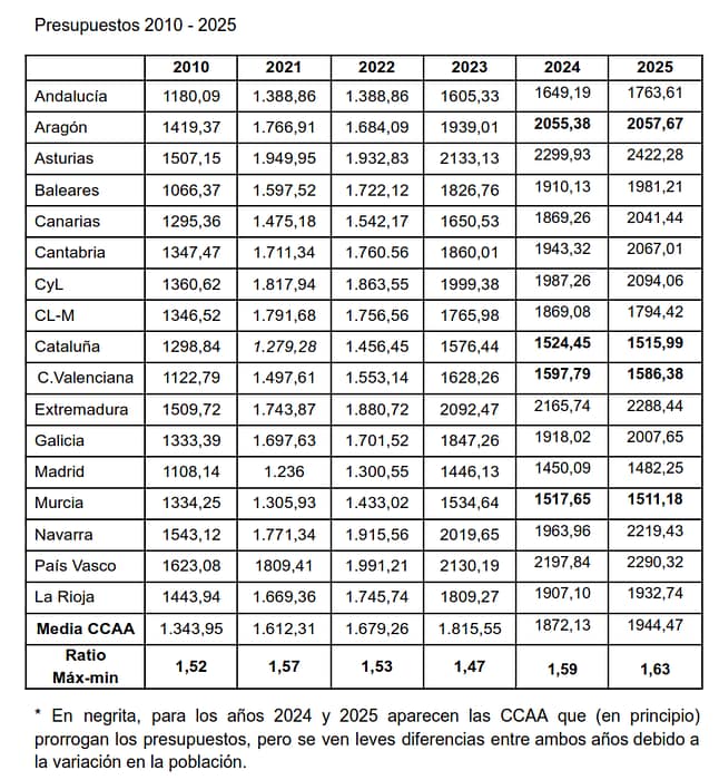 En la tabla siguiente se recoge el presupuesto por habitante y año previsto para 2025 en cada una de las CCAA, así como el promedio de las mismas. Para el cálculo de los presupuestos por habitante se han usado los datos de presupuestos anunciados por las comunidades autónomas, así como los datos de población (proporcionados por el INE) más recientes en función de cada año analizado. También se recogen los presupuestos de años anteriores, aunque las comparaciones con varios años, en este caso desde 2010, deben ser vistas con prudencia porque no se considera el efecto de la inflación.